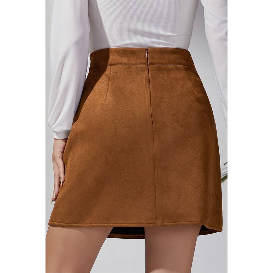Suede High Waist Metal Buckle Hip Skirt - KHAKI / Small is backordered and will ship as soon as it is back in stock.