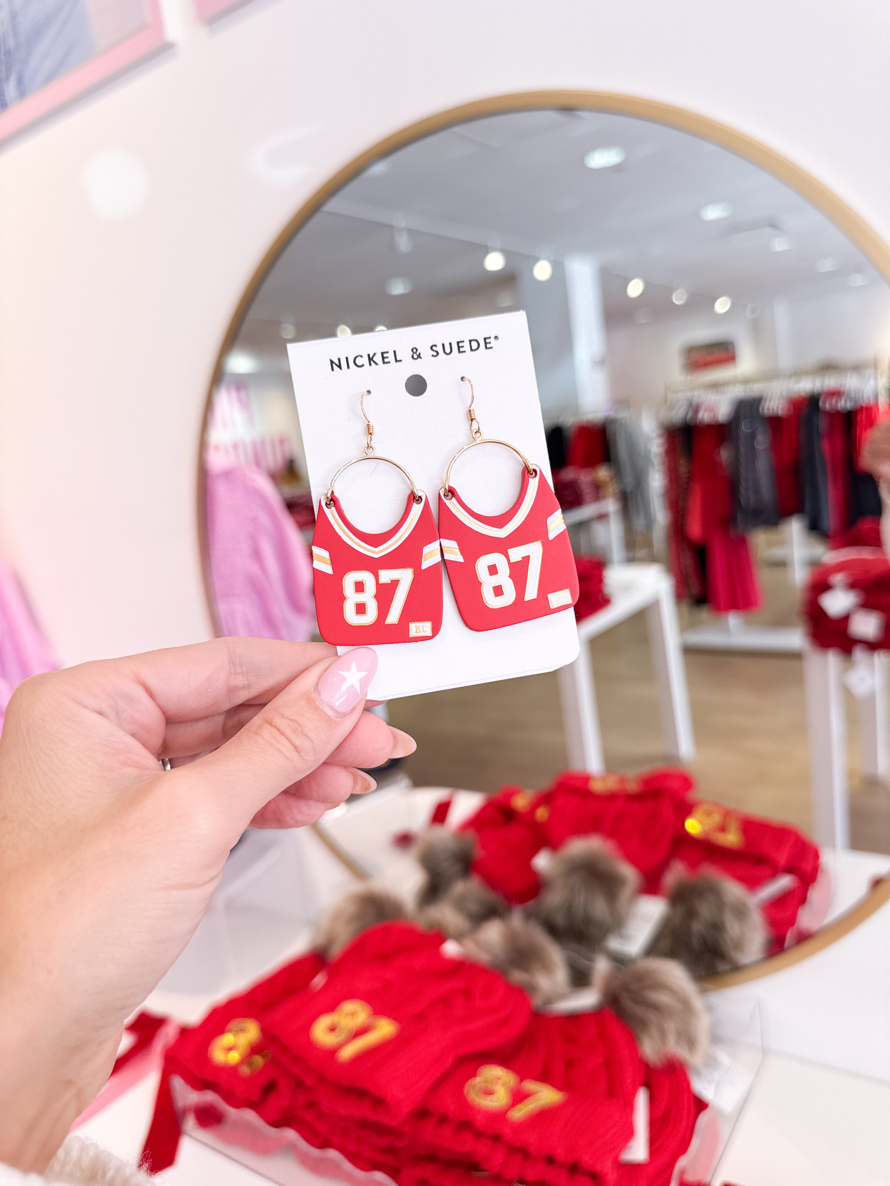 Elevate your game day look with our Kansas City Jersey #87 Earrings! These one-of-a-kind jersey shaped earrings are designed to honor our hometown team and Kansas City player #87. You'll be the MVP of stadium style when you sport this pair to any tailgate, watch party, or game! Show off your team spirit or gift them to the biggest fan you know. Made from premium Italian leather- these lightweight earrings are hand-embossed in Kansas City by Nickel & Suede.