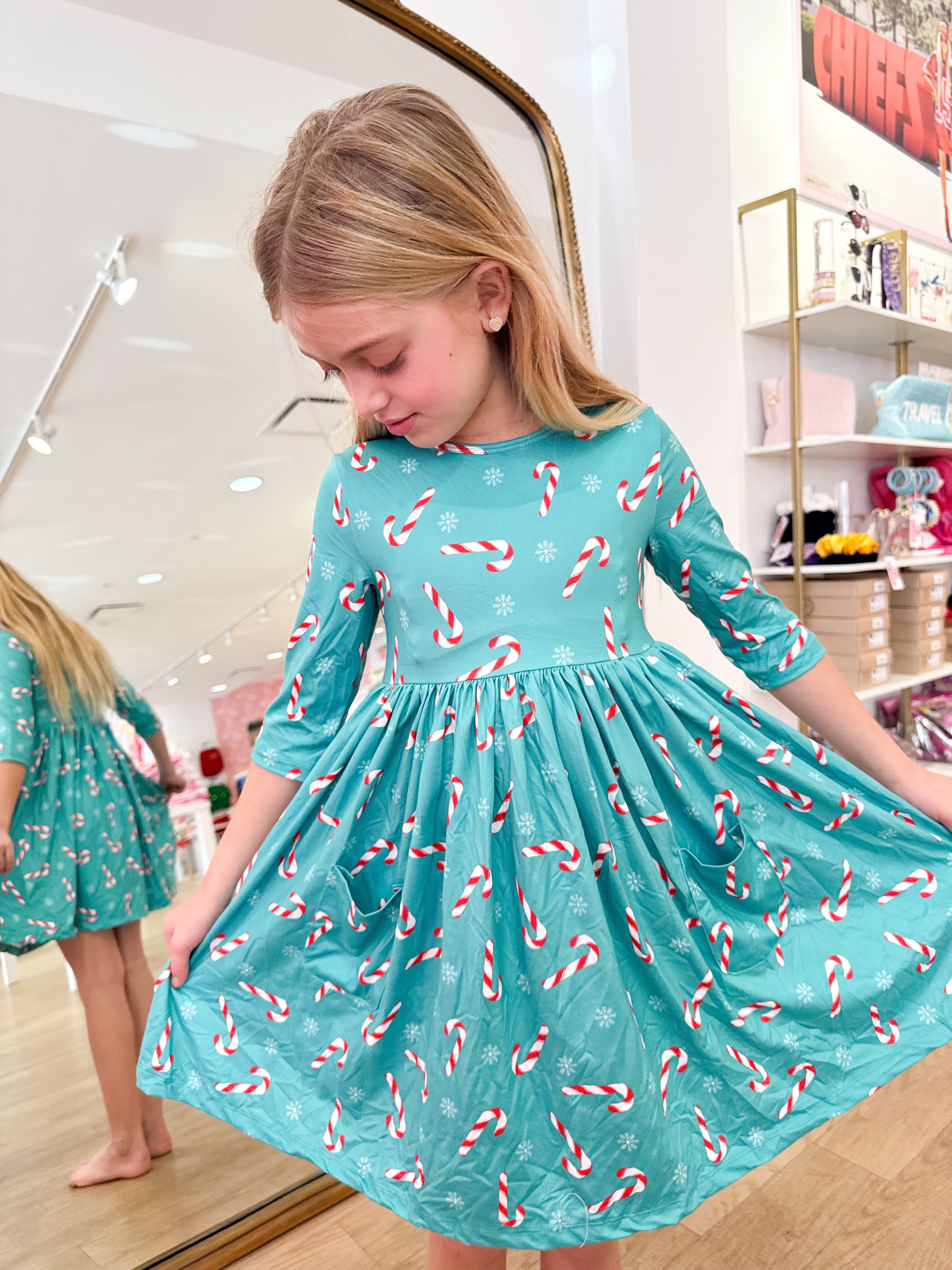 Youth Teal Christmas Candy 3/4 Sleeve Pocket Twirl Dress