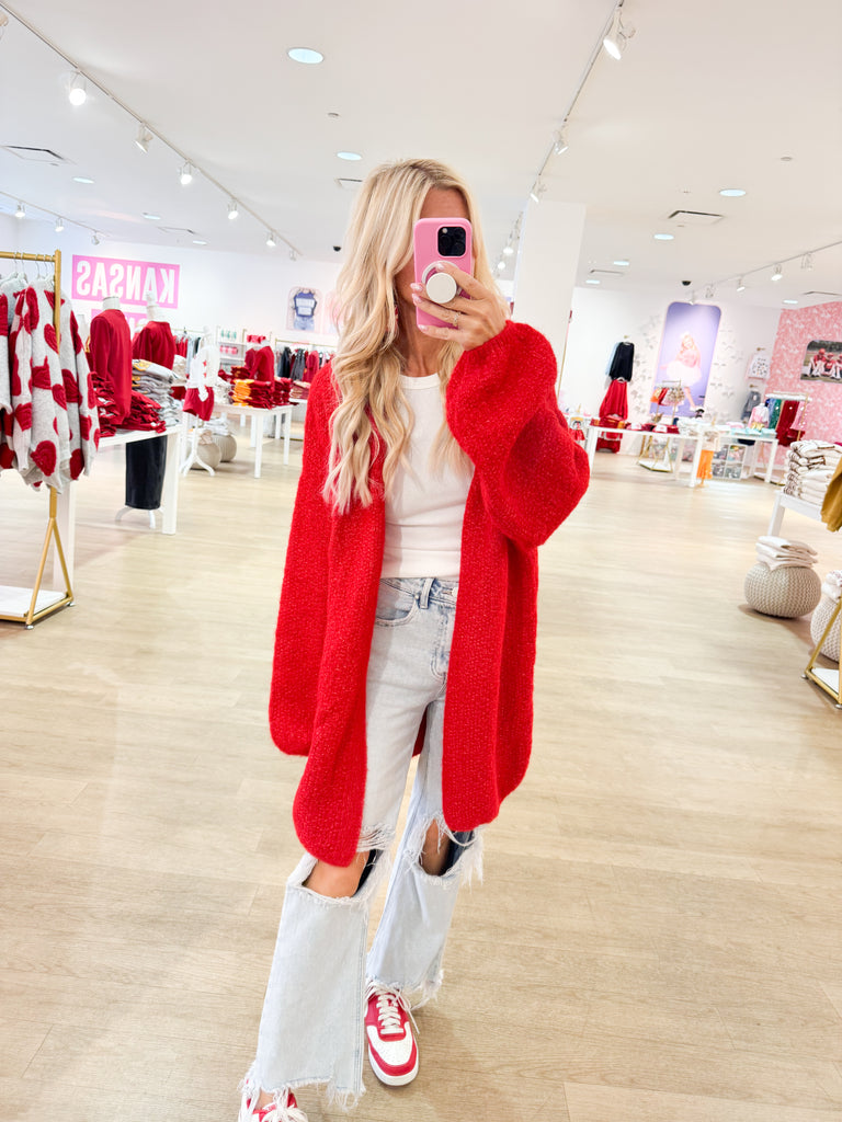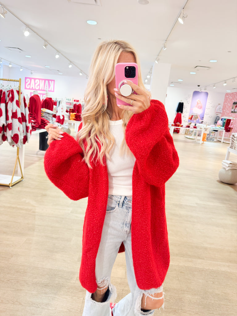 Red Oversized Cardigan - Small is backordered and will ship as soon as it is back in stock.