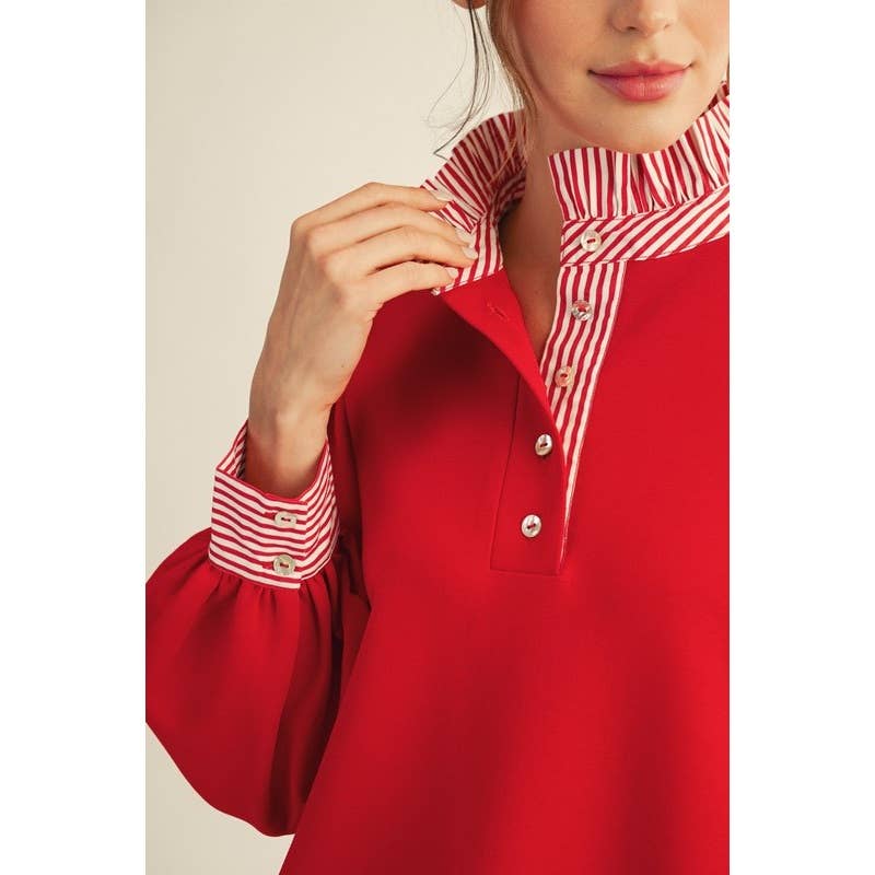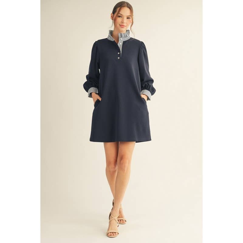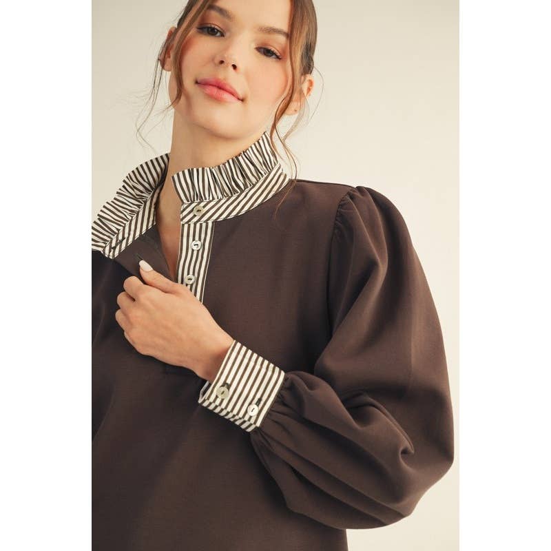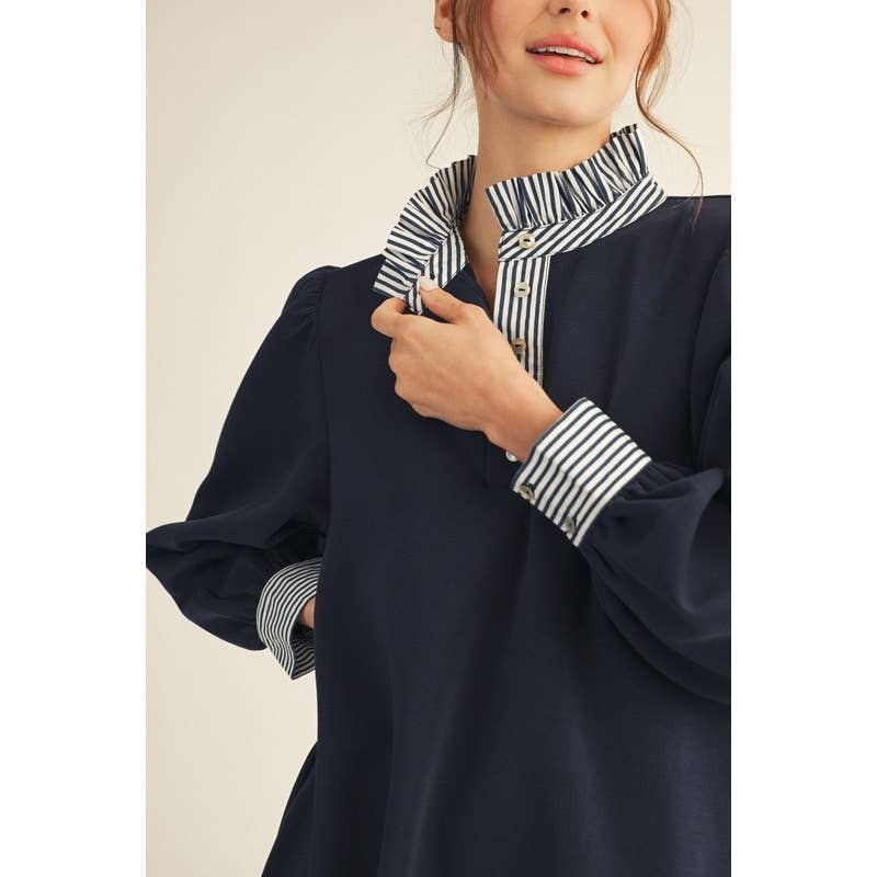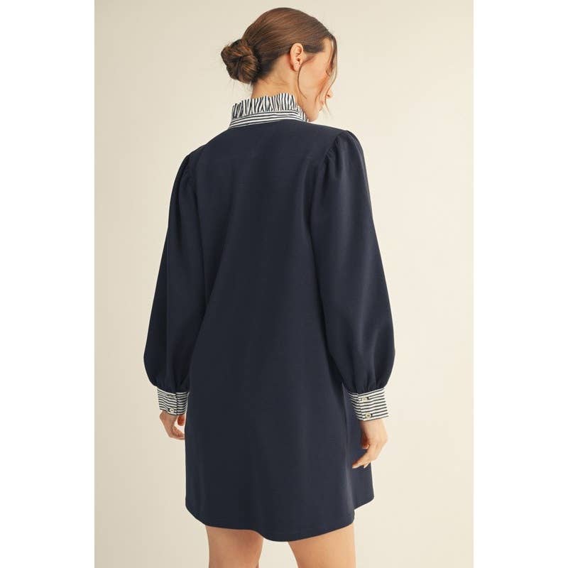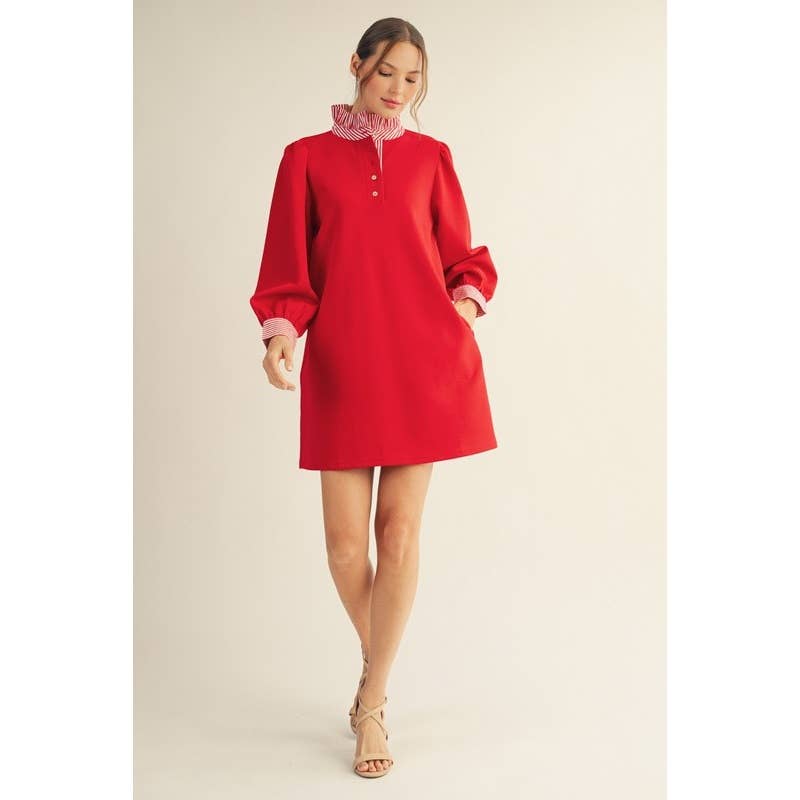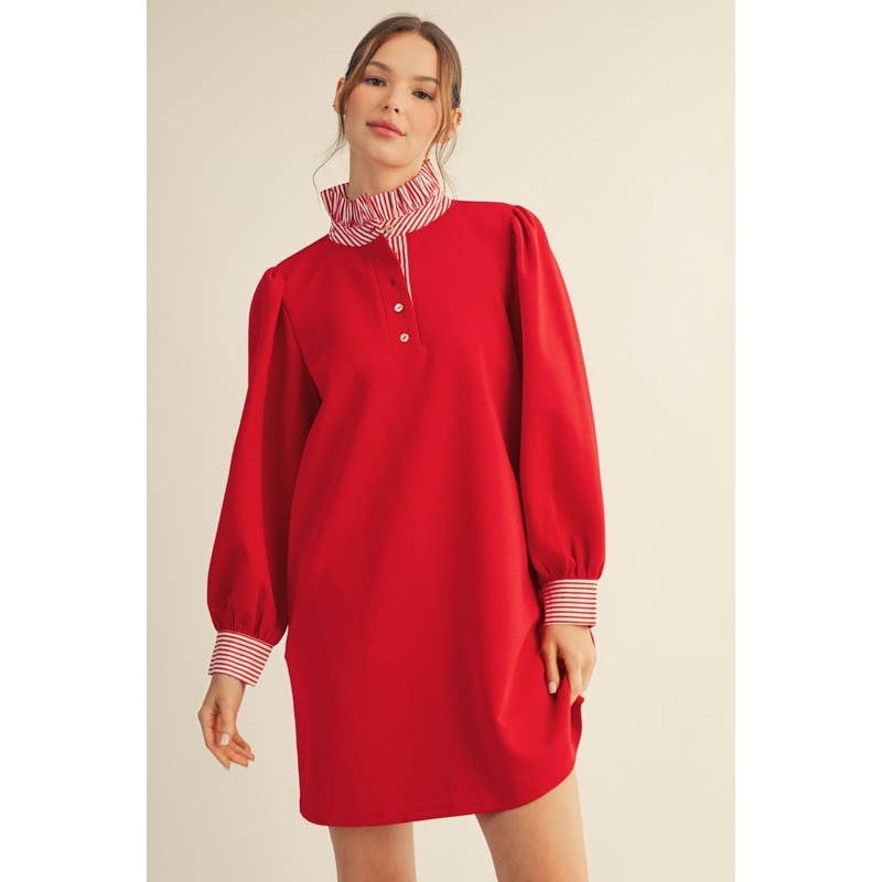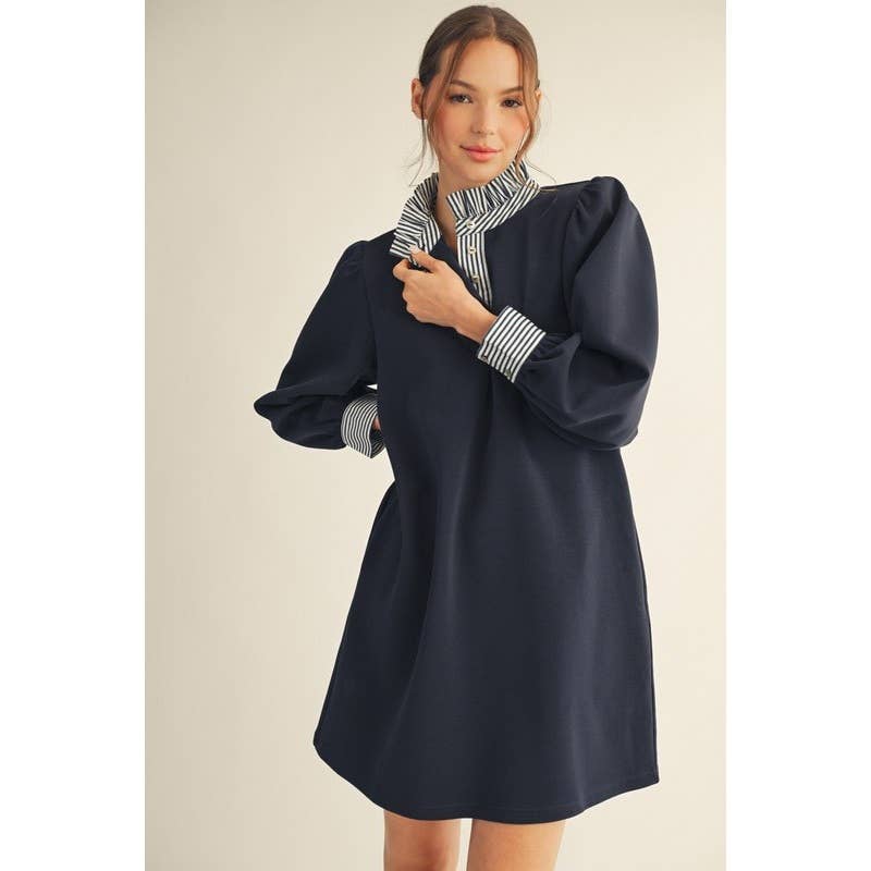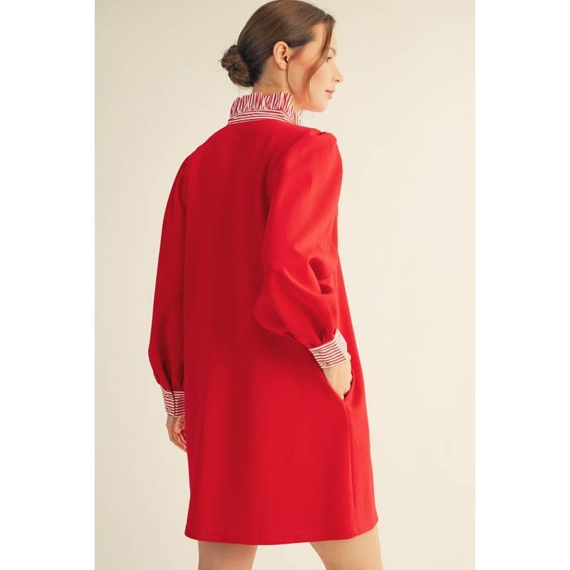 - Stripe Contrast Accent Solid Shift Dress - Long puff sleeves solid shift dress with side pockets, front button up, ruffled neckline, stripe contrast accent. - Model is 5'10'' and is wearing a Small. - 50% RAYON 45% POLYESTER 5% SPANDEX