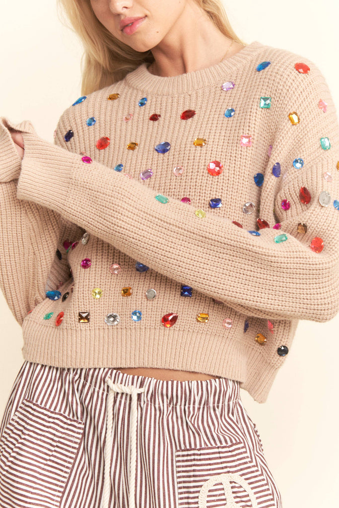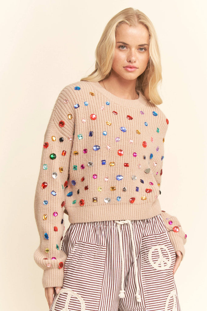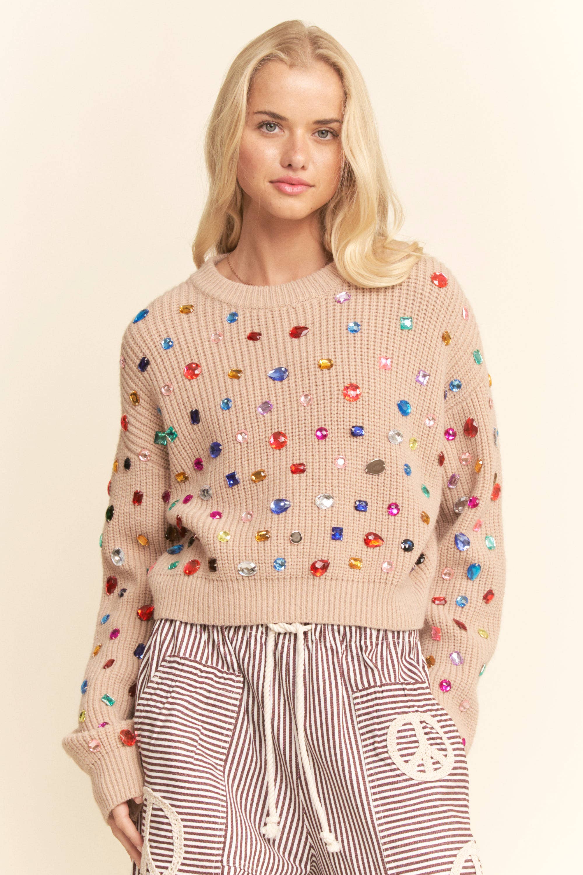 Cozy meets sparkle in this Soft Knit Bedazzled Nude Sweater. Wrapped in a gentle nude hue, its soft knit fabric keeps you comfy all day, while subtle bedazzled details add a playful touch of glamour. Perfect for those days when you want to feel luxe without trying too hard!