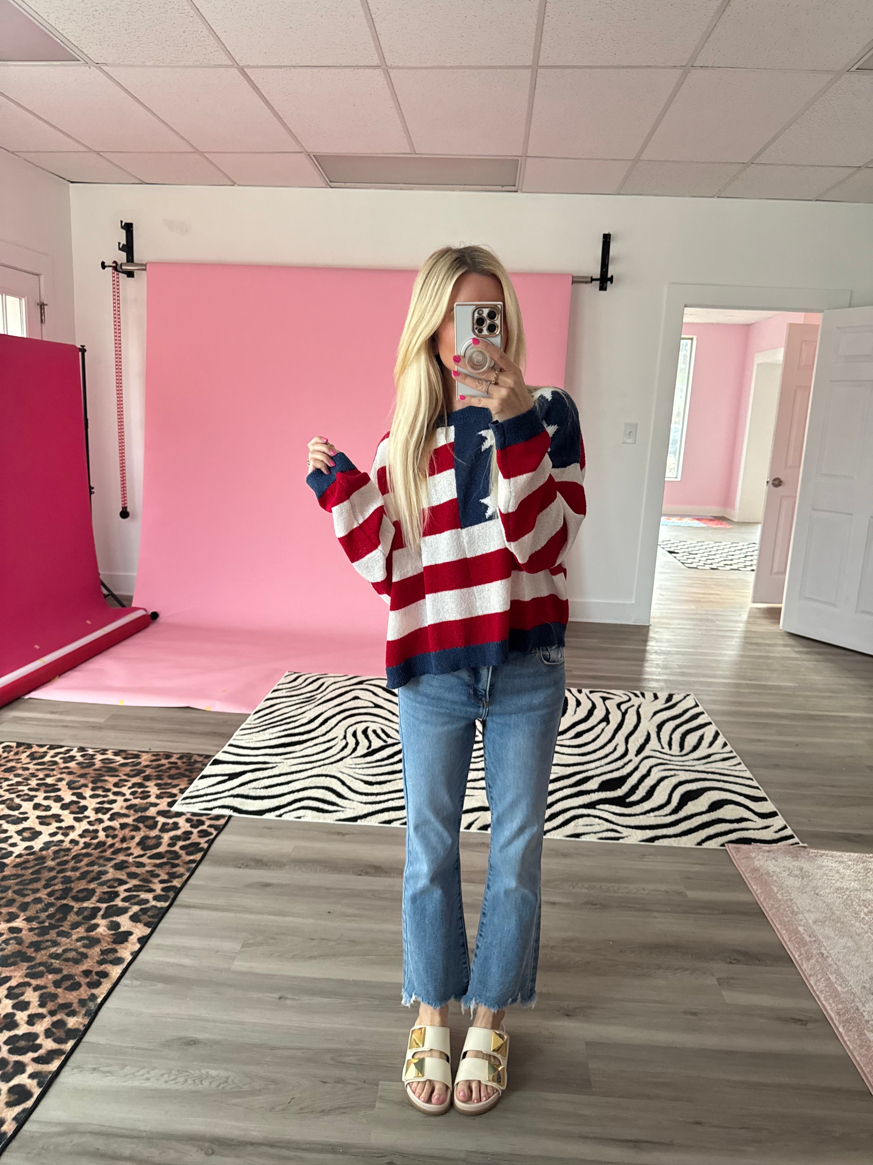 Show your stars and stripes with this snazzy American Flag Long Sleeve Top—perfect for those who want to keep it comfy while waving the red, white, and blues! Slip it on and strut your stuff, because freedom looks good on you!