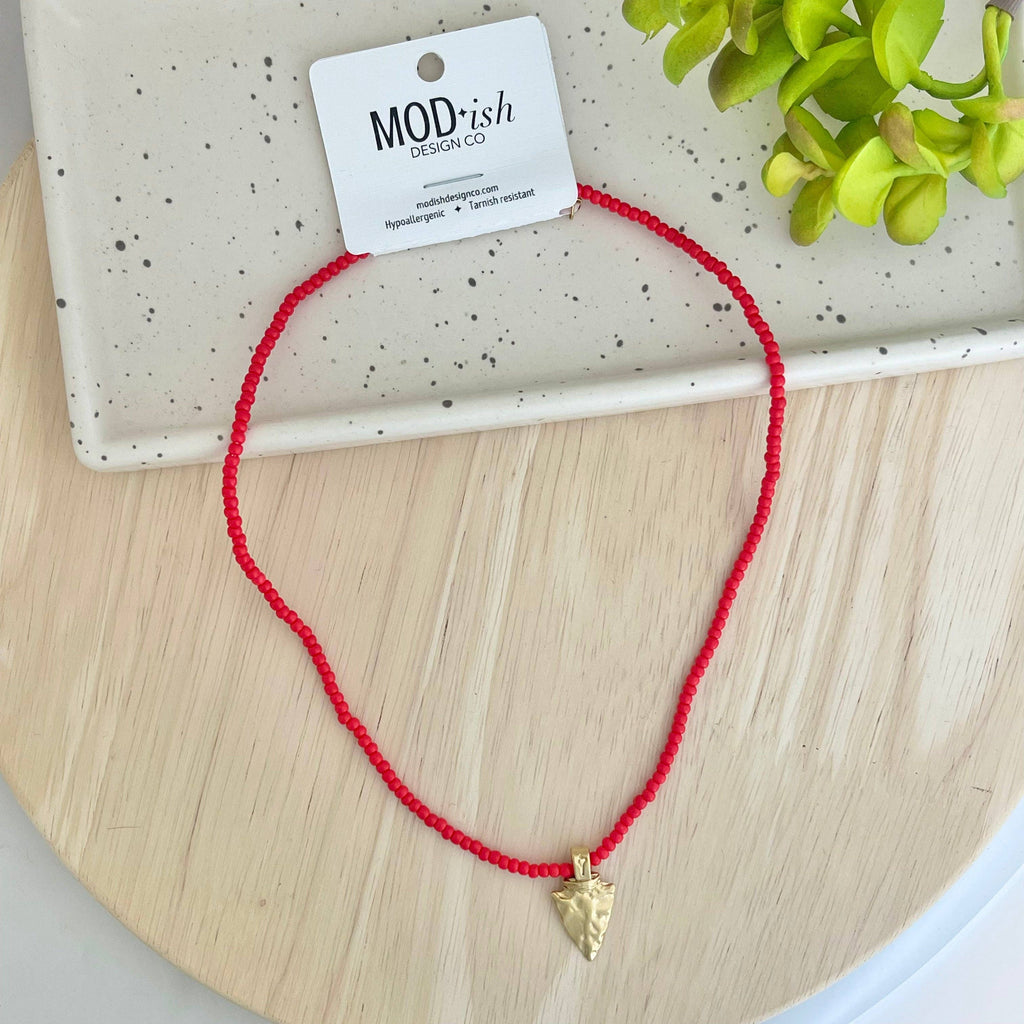 ✦ Dainty seed bead necklace with a gold arrowhead charm ✦ 16" length with a 2" extender ✦ A portion of every purchase helps foster children and the families who care for them! Thank you for supporting this women-owned, small business!