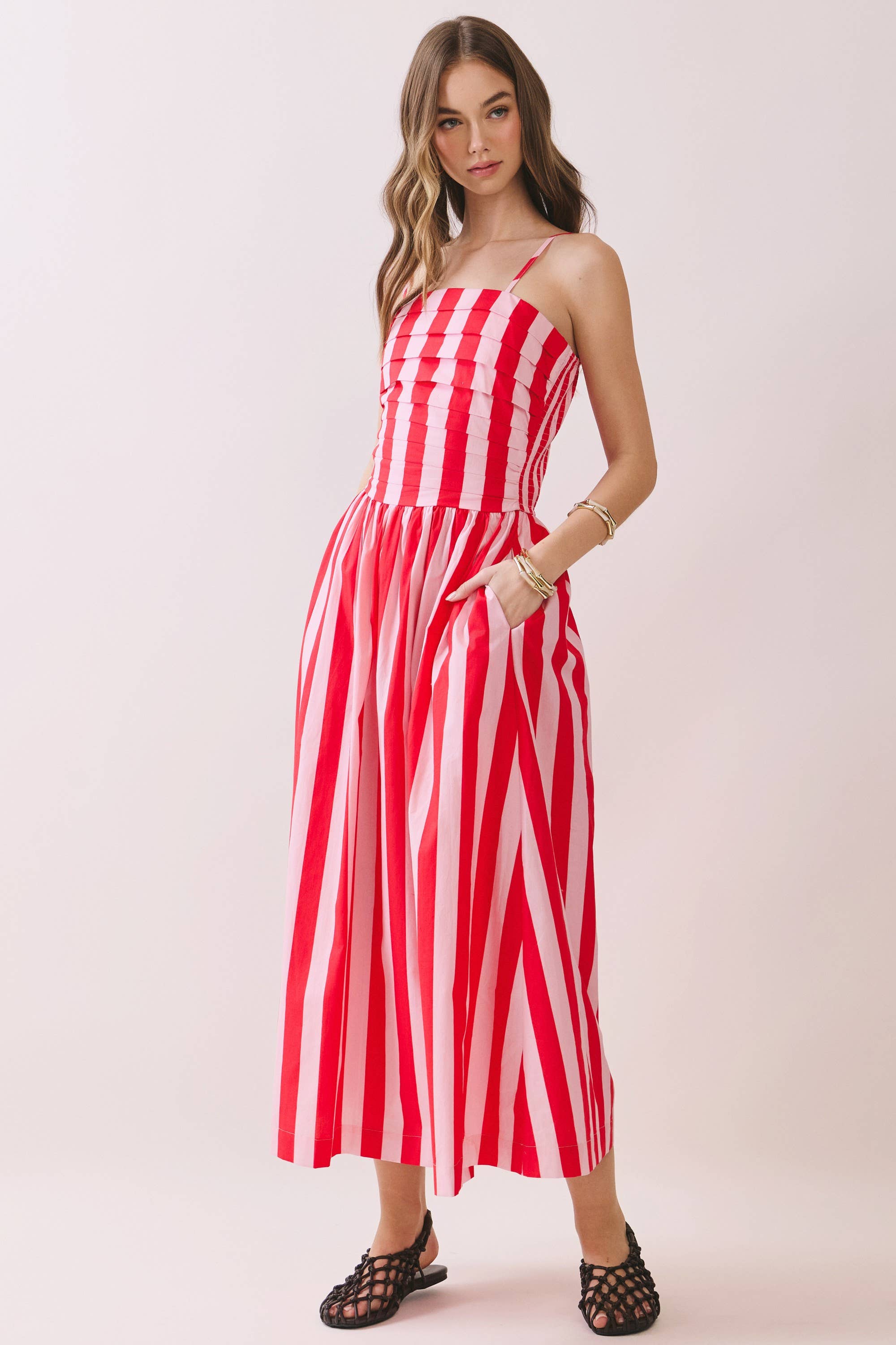 Stripe Back Side Pockets Smocked Midi Dress - S is backordered and will ship as soon as it is back in stock.