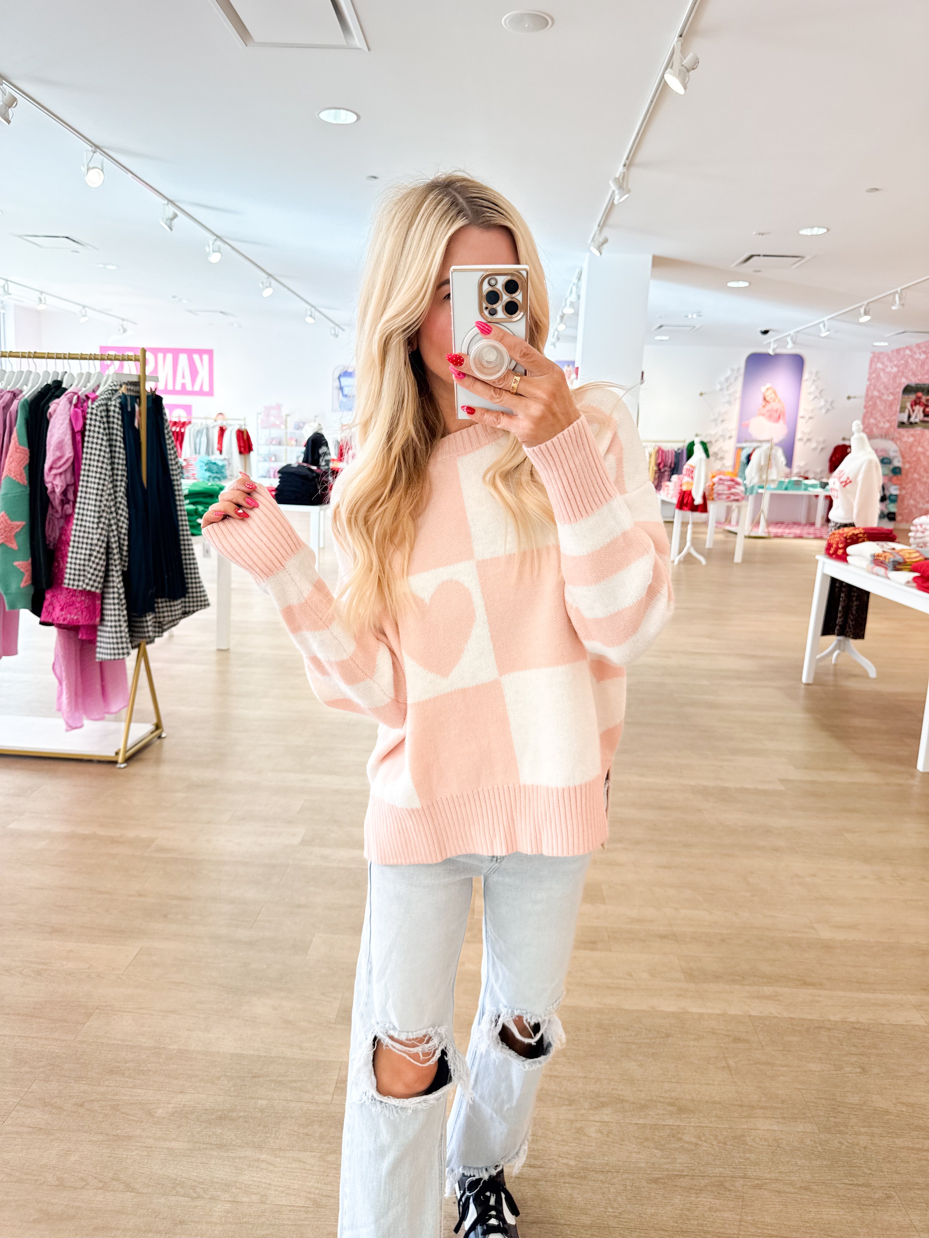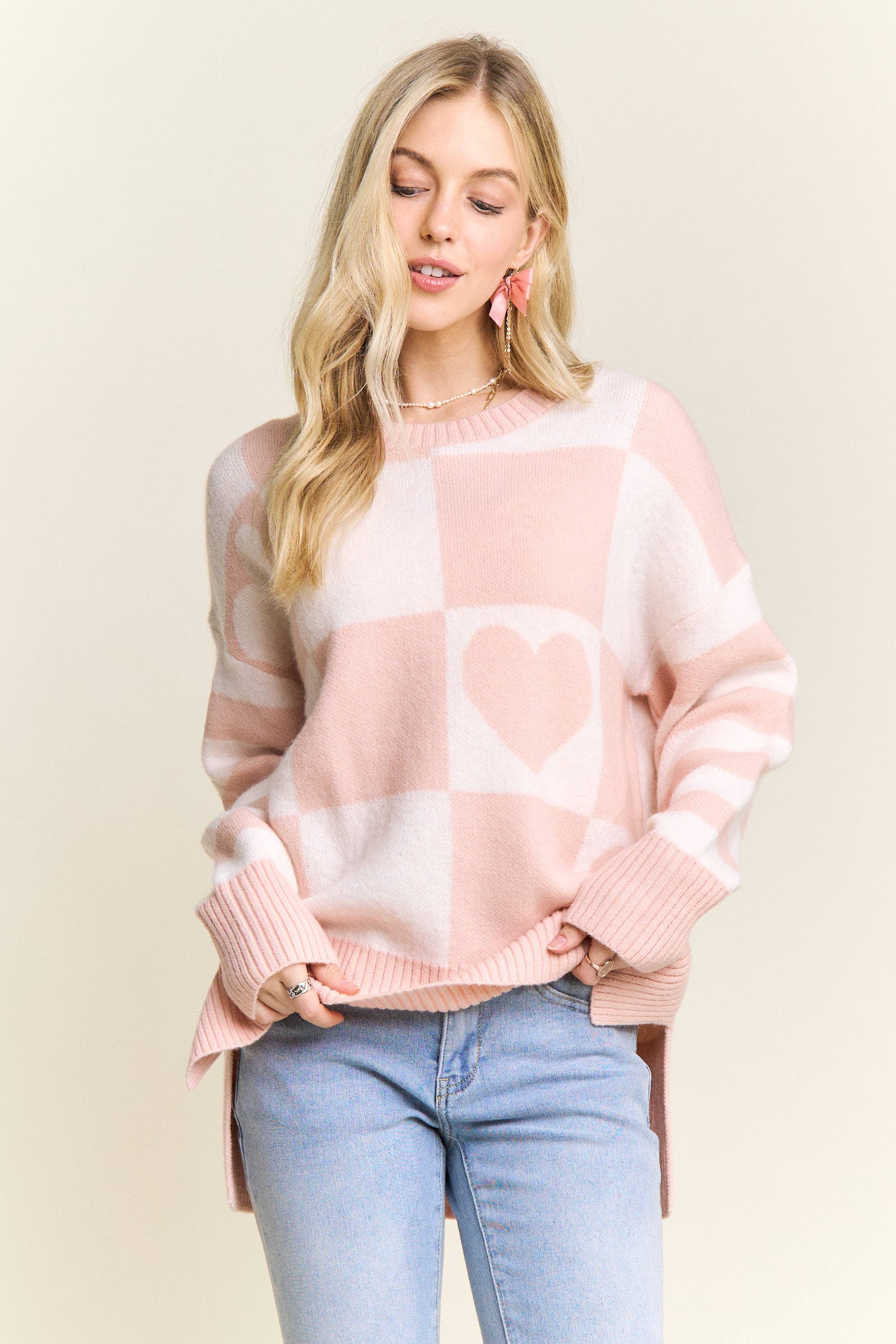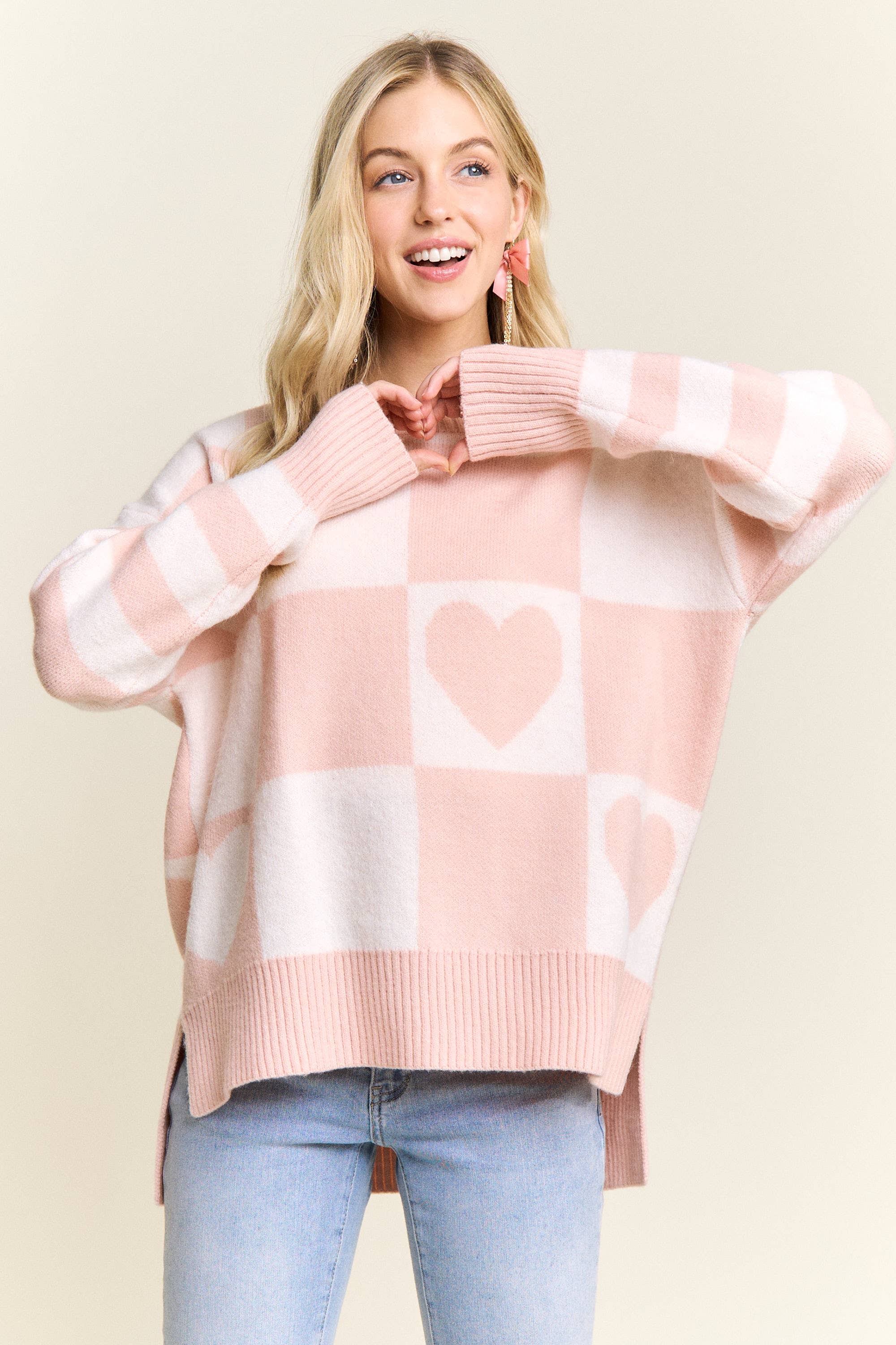 A cozy and stylish sweater crafted for comfort and visual appeal. The prominent checkerboard pattern offers a classic yet contemporary aesthetic, while the subtle heart motif adds a touch of unique charm and personality. This sweater features a comfortable crew neck design, ideal for everyday wear, and is built to provide warmth without being overly bulky. Its blend of synthetic fibers contributes to easy care and resistance to shrinking or stretching.