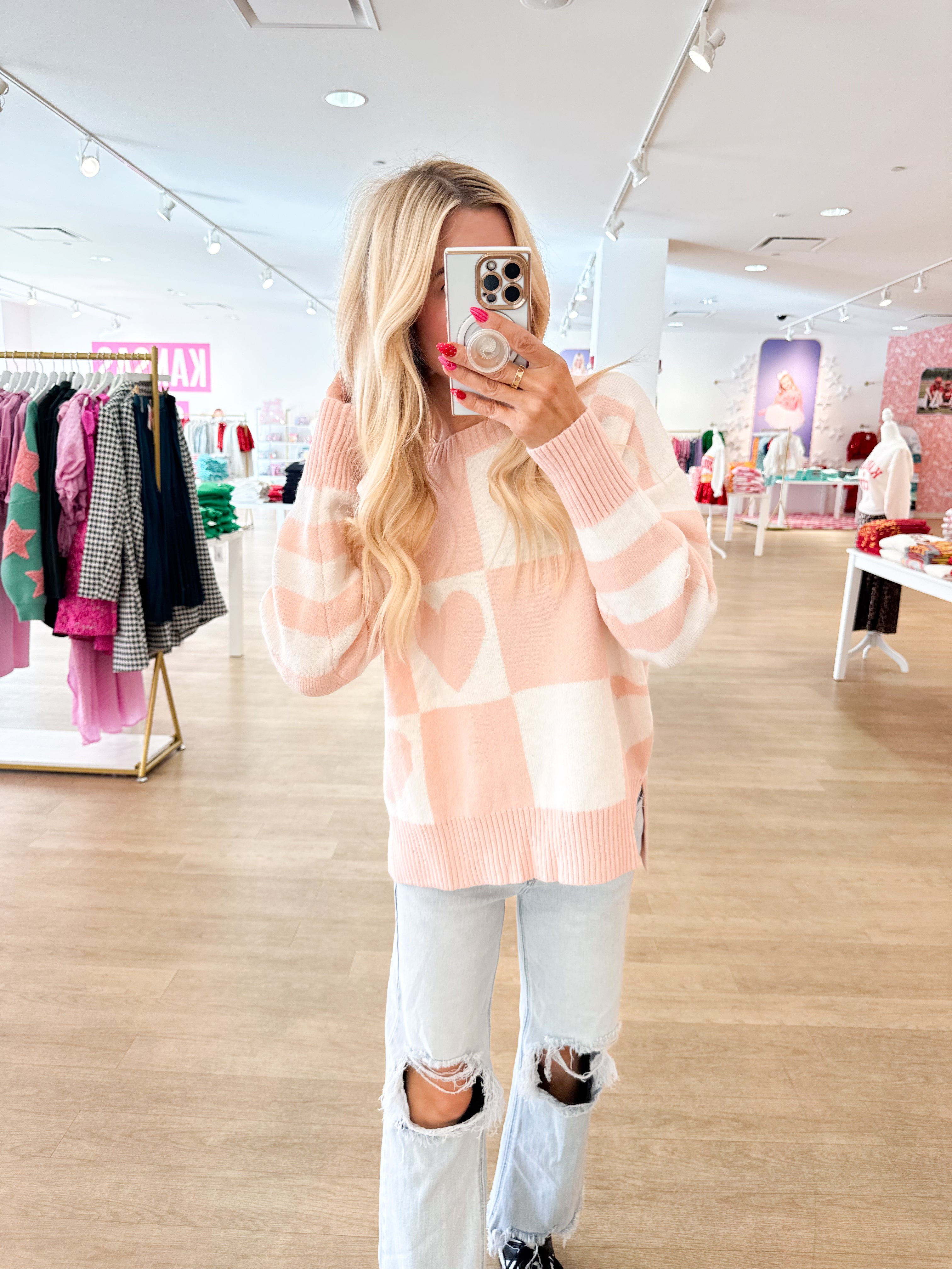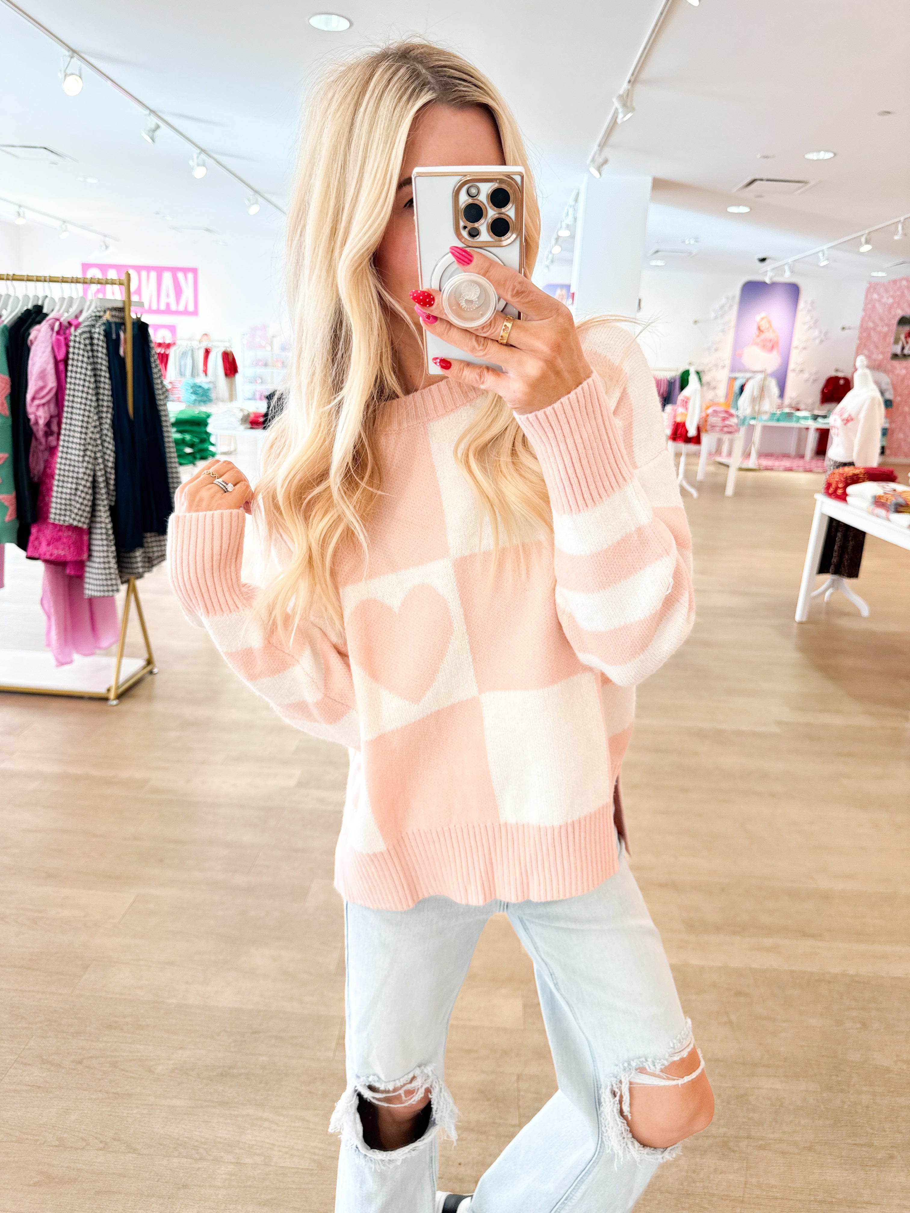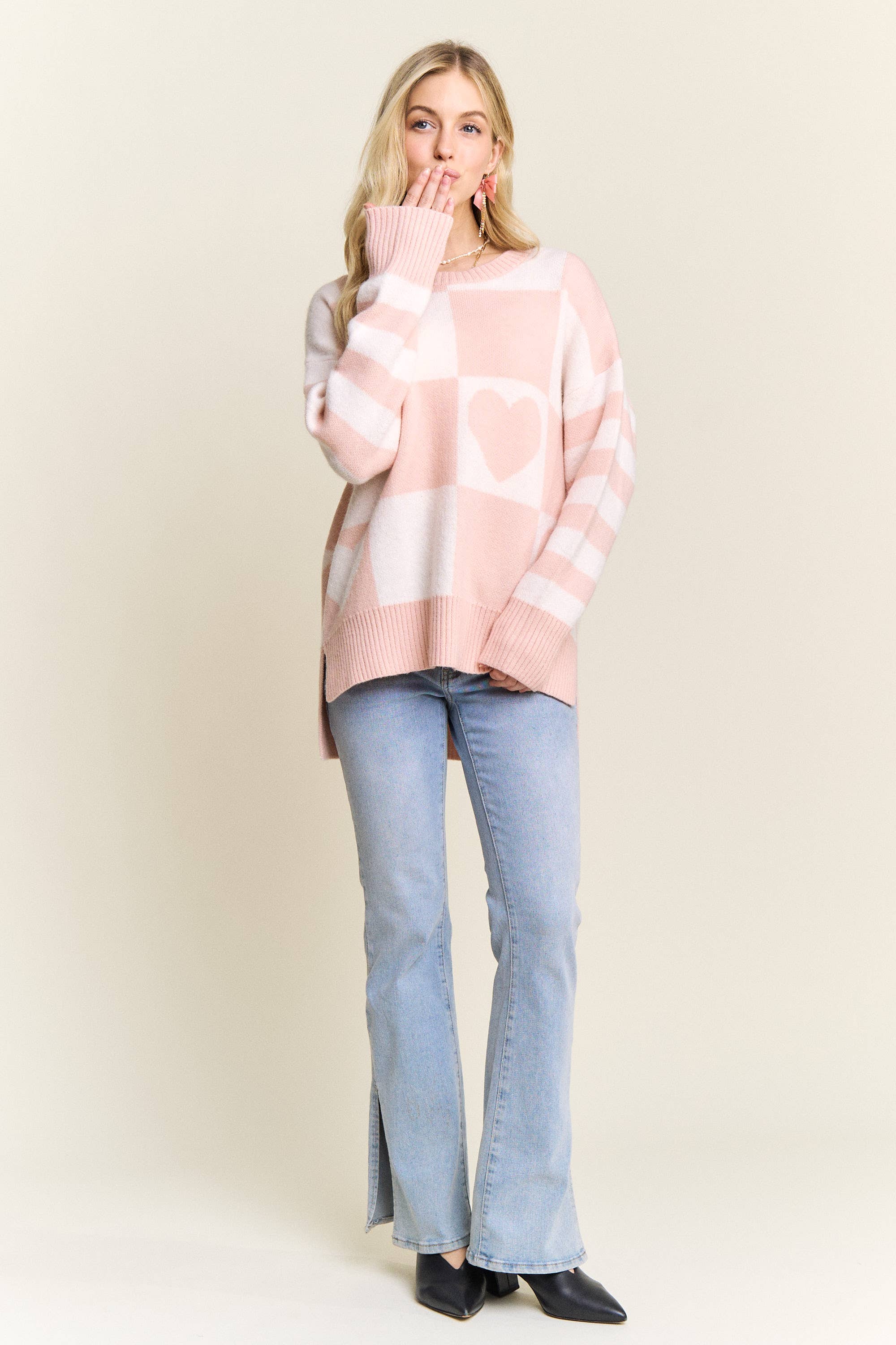 A cozy and stylish sweater crafted for comfort and visual appeal. The prominent checkerboard pattern offers a classic yet contemporary aesthetic, while the subtle heart motif adds a touch of unique charm and personality. This sweater features a comfortable crew neck design, ideal for everyday wear, and is built to provide warmth without being overly bulky. Its blend of synthetic fibers contributes to easy care and resistance to shrinking or stretching.
