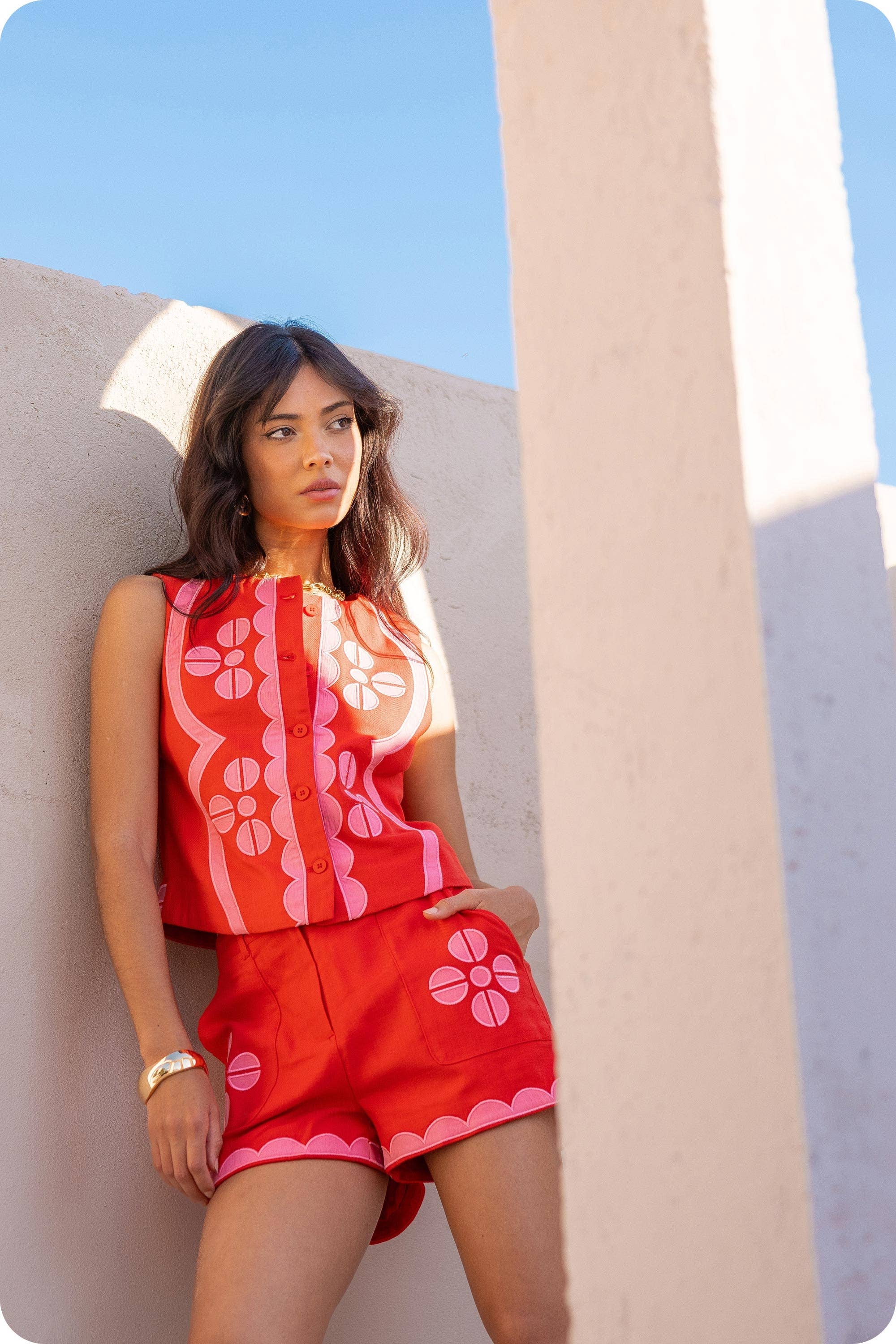 Strut and Bolt Collection. Contrast embroidered shorts in cotton twill fabric. This exquisite style features intricate geometric scallop embroidery, front pockets, hook and eye with zipper closure, elasticated waistband at back, and belt loops. It can be made into a set with vest