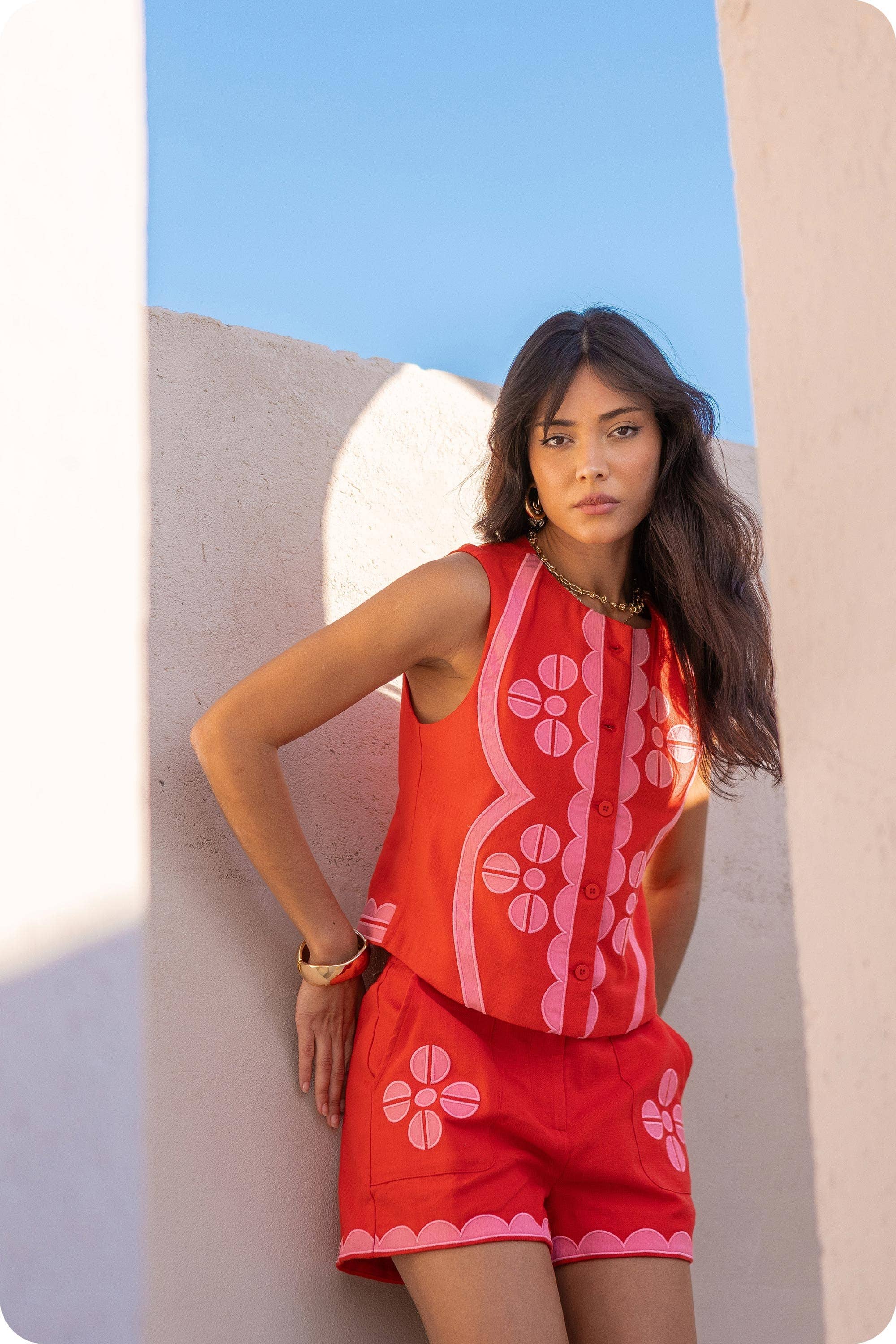 Strut and Bolt Collection. Contrast embroidered vest top in cotton twill fabric. This exquisite sleeveless vest top hybrid features intricate geometric scallop embroidery at front/back, button down closure at front, round neckline, and lining. It can be made into a set with shorts