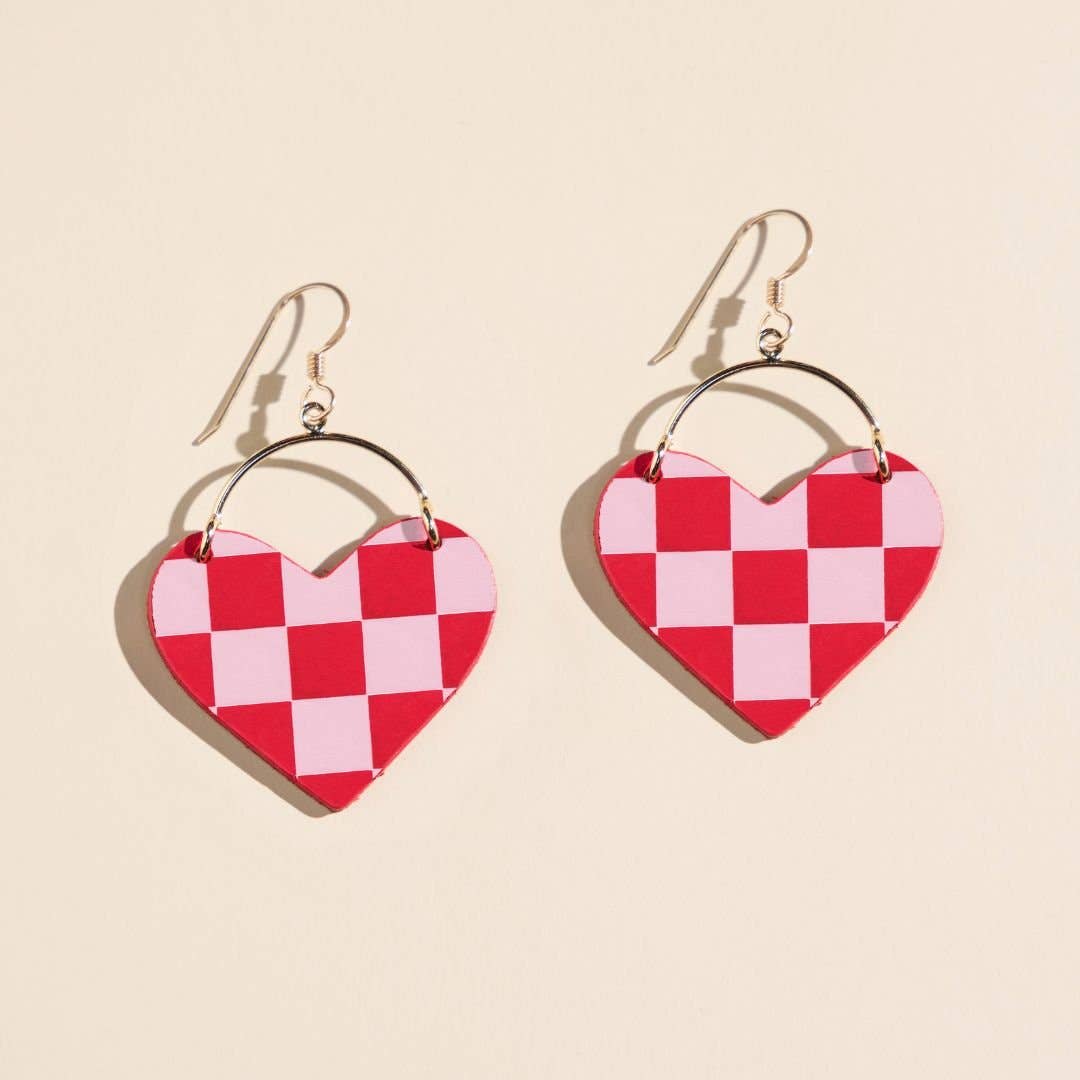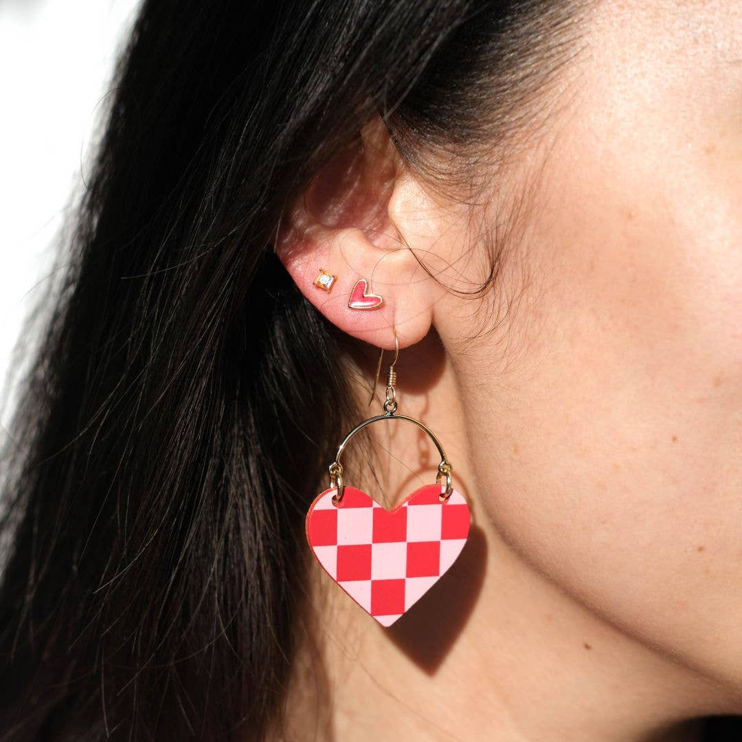 Crimson & Pink Checkmate Heart Earrings - Gold is backordered and will ship as soon as it is back in stock.