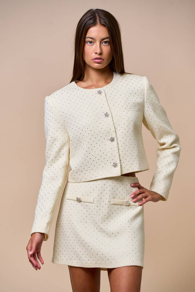 This chic tweed mini skirt is elevated with sparkling rhinestone accents, creating a polished yet playful look. Its structured silhouette and eye-catching detail make it a perfect piece for dressing up casual ensembles or shining at special occasions. Tags: Tweed Skirt, Rhinestone Detail, Mini Skirt, Statement Piece, Polished Look, Elegant Style, Party Wear, Textured Fabric