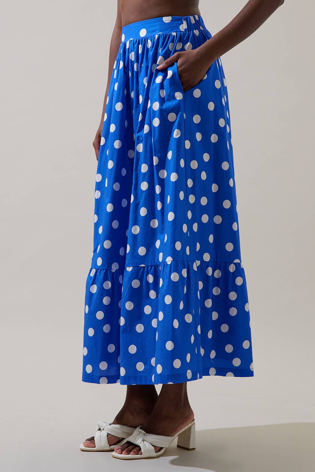 Step into a world of vibrant color and playful charm with this stunning polka dot maxi skirt. The bold, contrasting pattern and flowing A-line silhouette creates a cheerful look. Featuring a comfortable, fitted waistband and a flirty ruffled hemline. Pair it with the matching top for a full look.