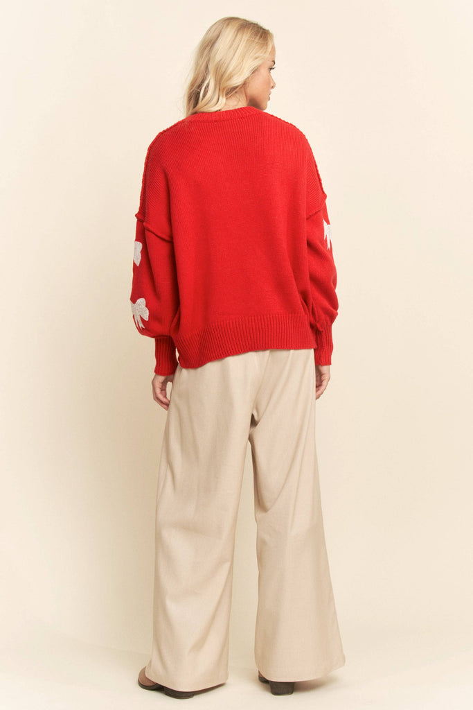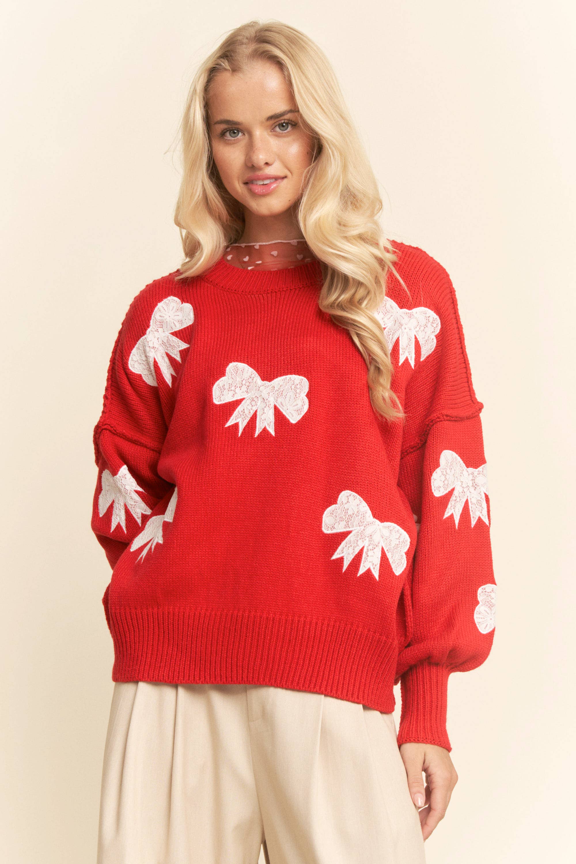 Elevate everyday style with this charming bow-accent knit sweater. Designed with a relaxed fit and feminine details, it’s a boutique-ready staple that blends cozy comfort with standout appeal. Perfect for chic layering and versatile wear through the season. Model is wearing Small Height: 5'10" Bust : 34 Waist : 25” Hips : 35”