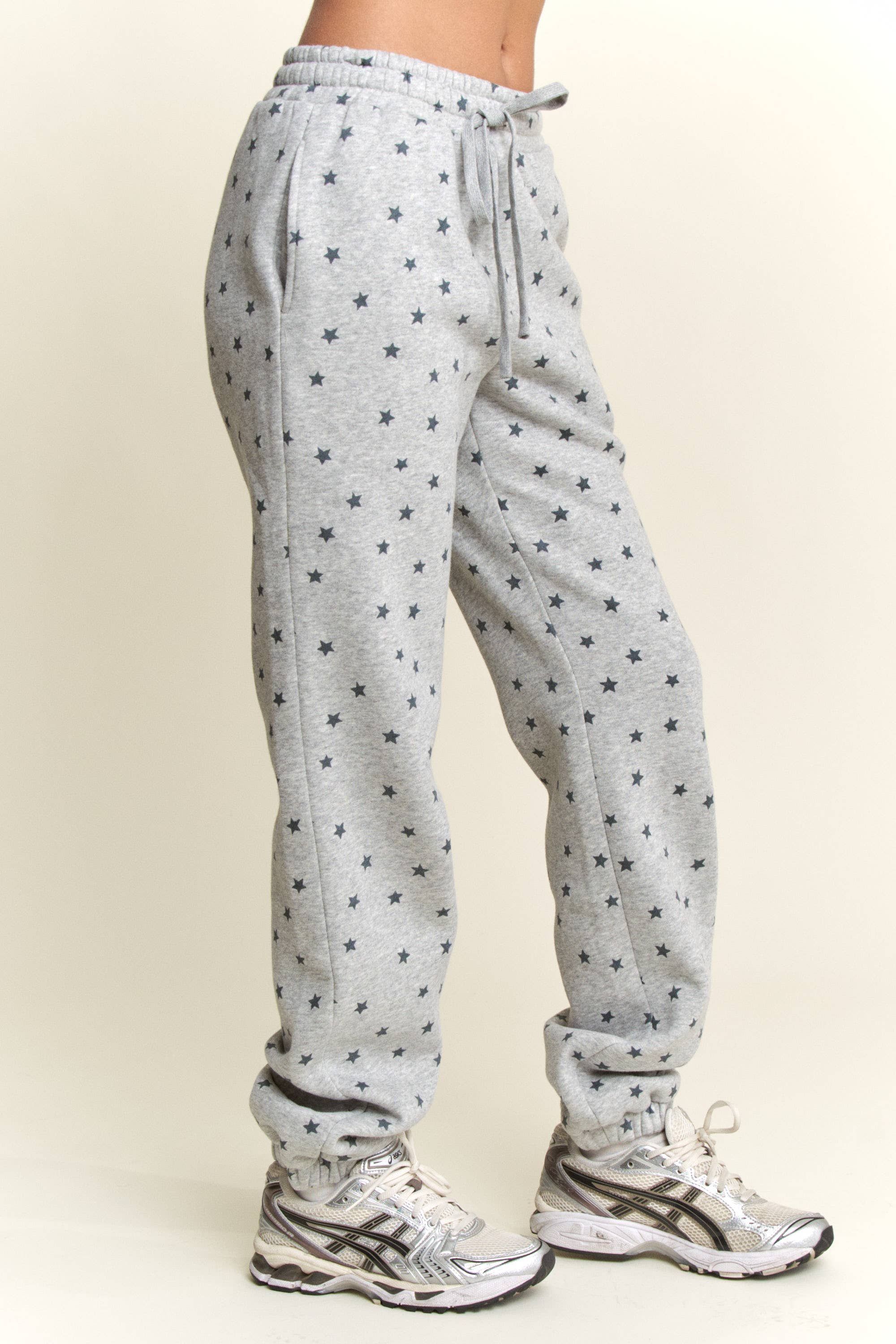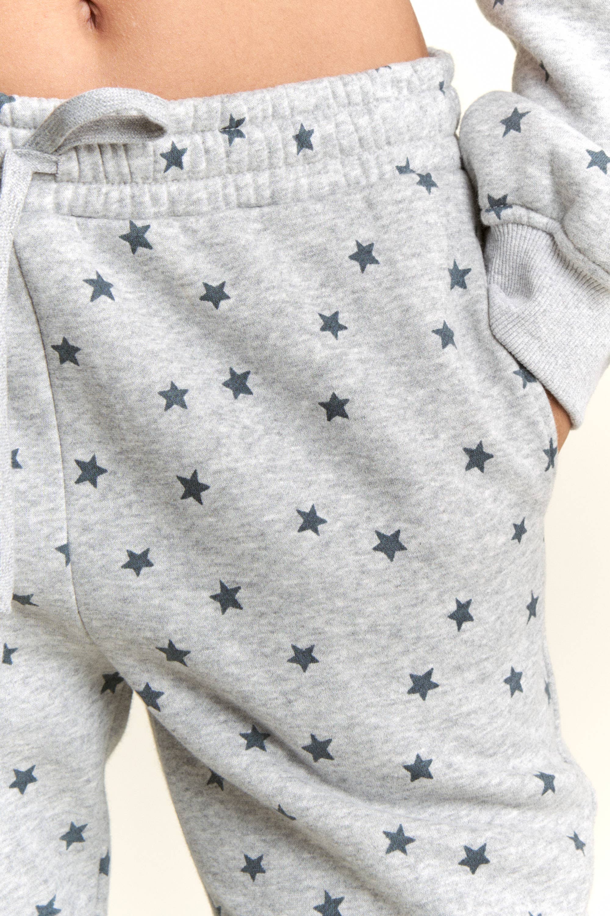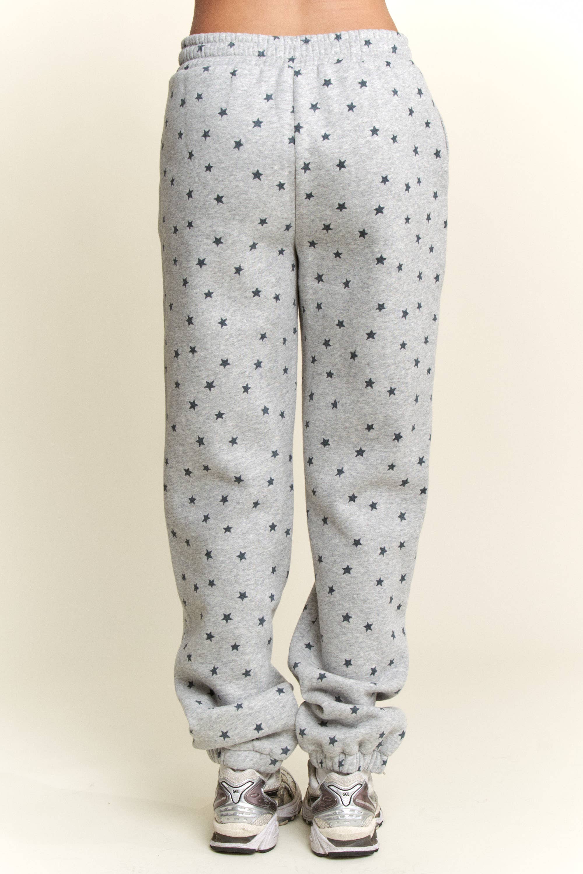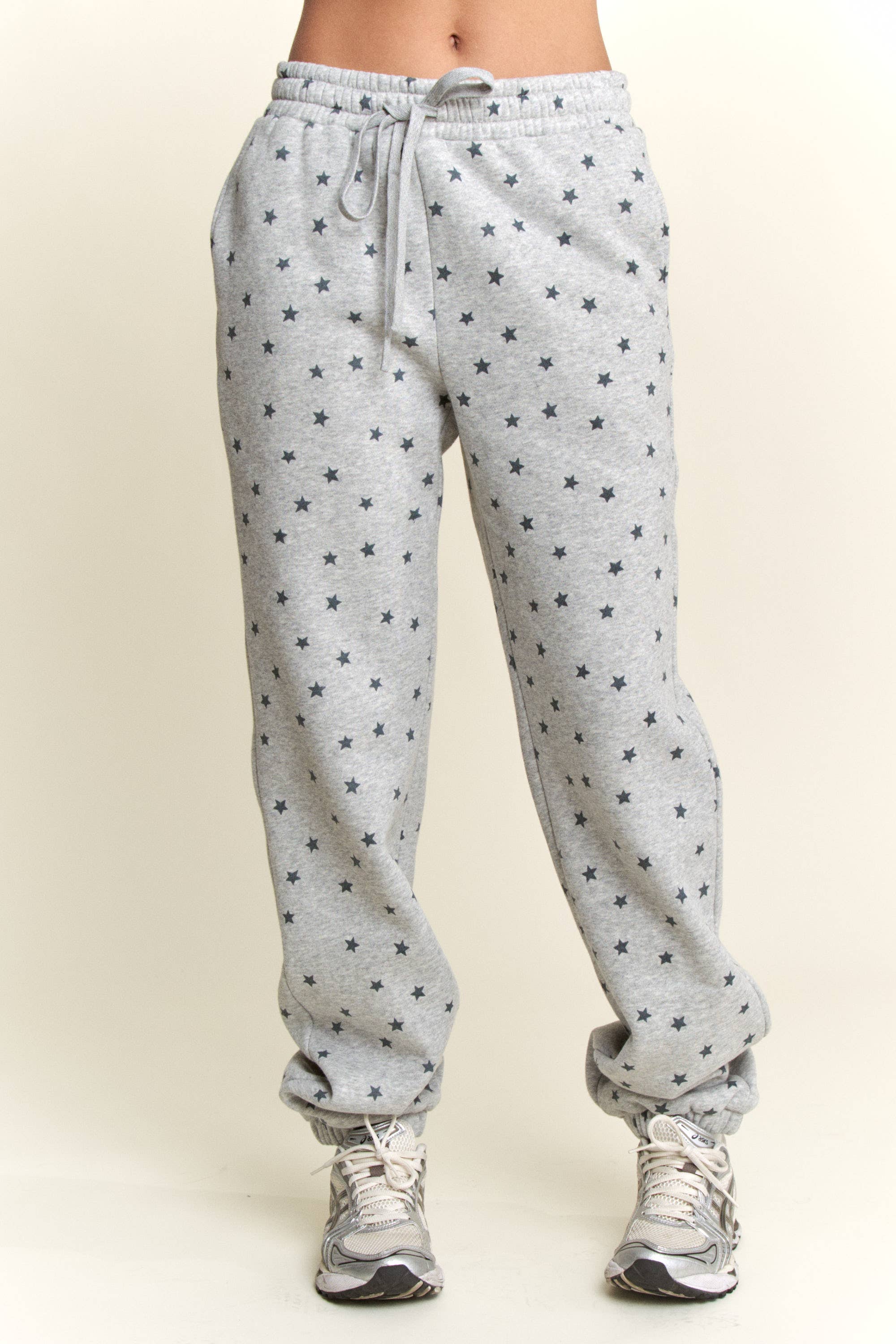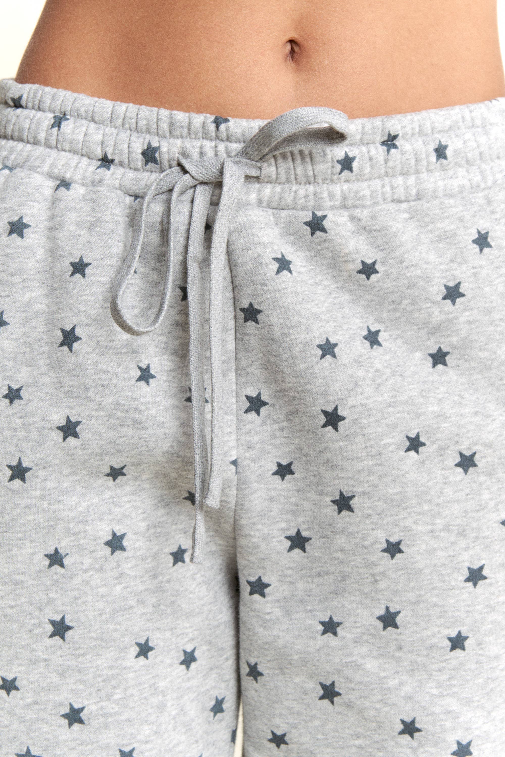 Add a playful twist to your loungewear with these Grey Star Print Sweatpants. Featuring an all-over navy star pattern, elastic waistband with adjustable drawstring, and gathered cuffs for a relaxed yet secure fit. Made with soft fleece interior, these joggers are perfect for casual streetwear, cozy lounging, or pairing with sneakers for an everyday athleisure vibe. - Heather grey sweatpants with star print - All-over navy star design - Elastic waistband with adjustable drawstring - Relaxed fit with cuffed hem - Soft fleece lining for comfort - Perfect for lounging, travel, or casual outfits